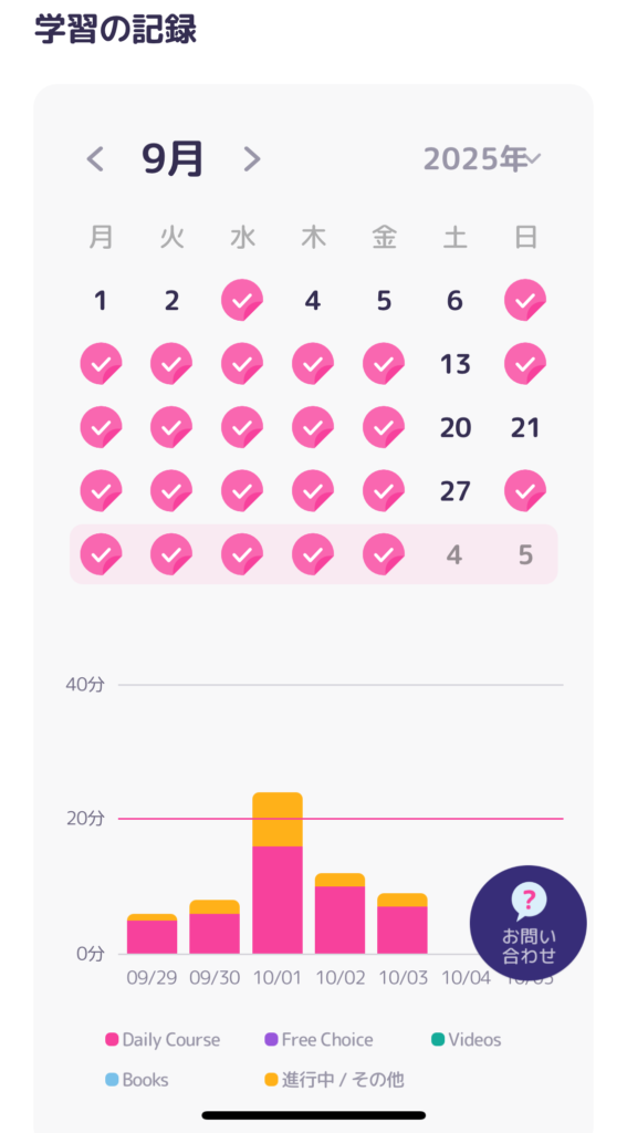 主に平日に、1日あたり大体10~20分の学習を続けています。